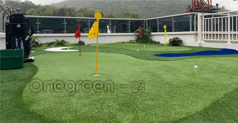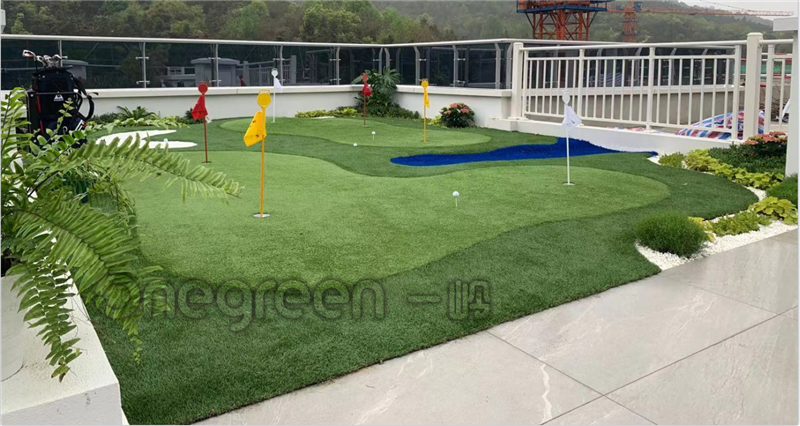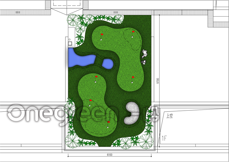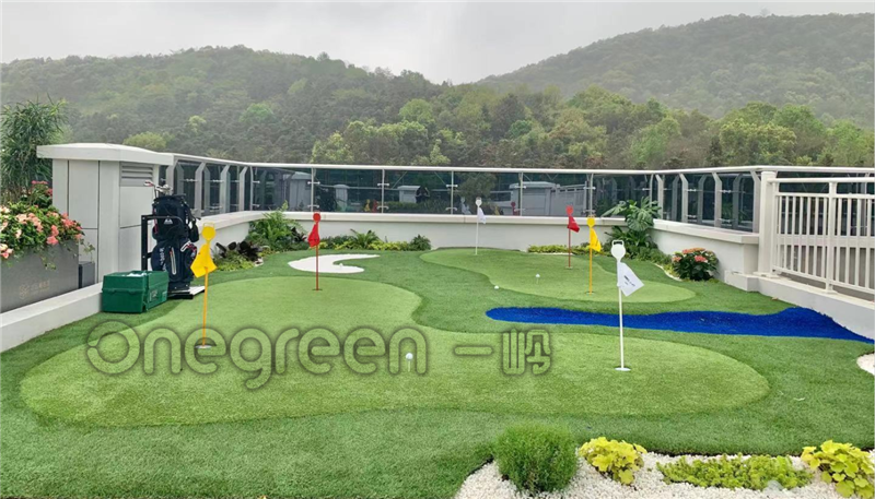 項目面積60平,由果嶺,長草,石英沙坑,仿真水景草,景觀石搭配綠化