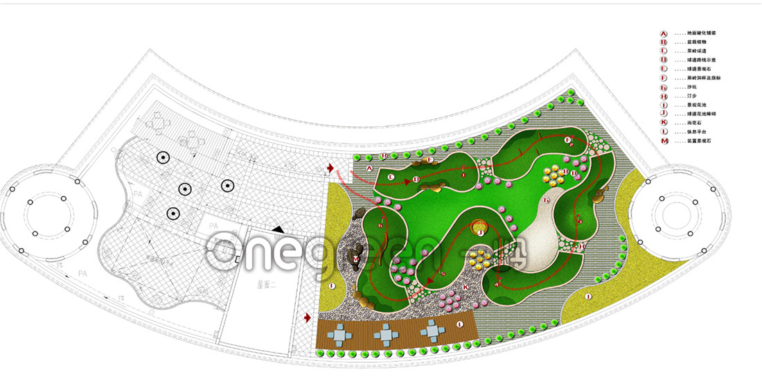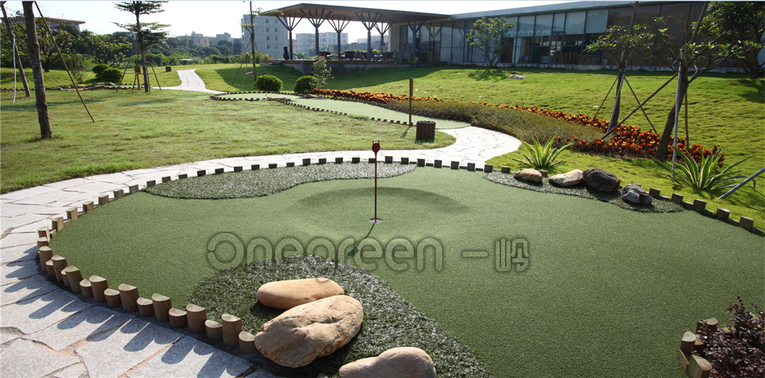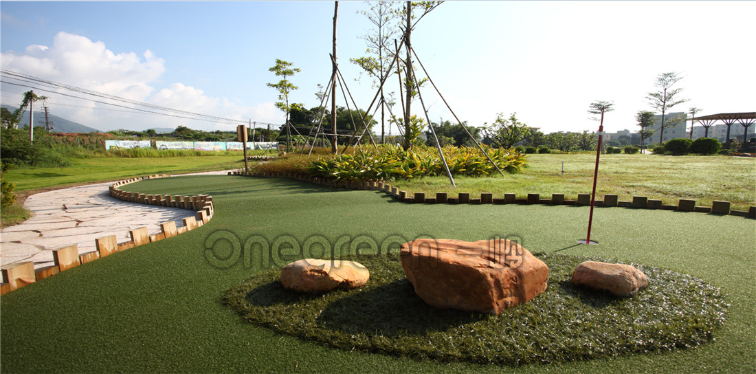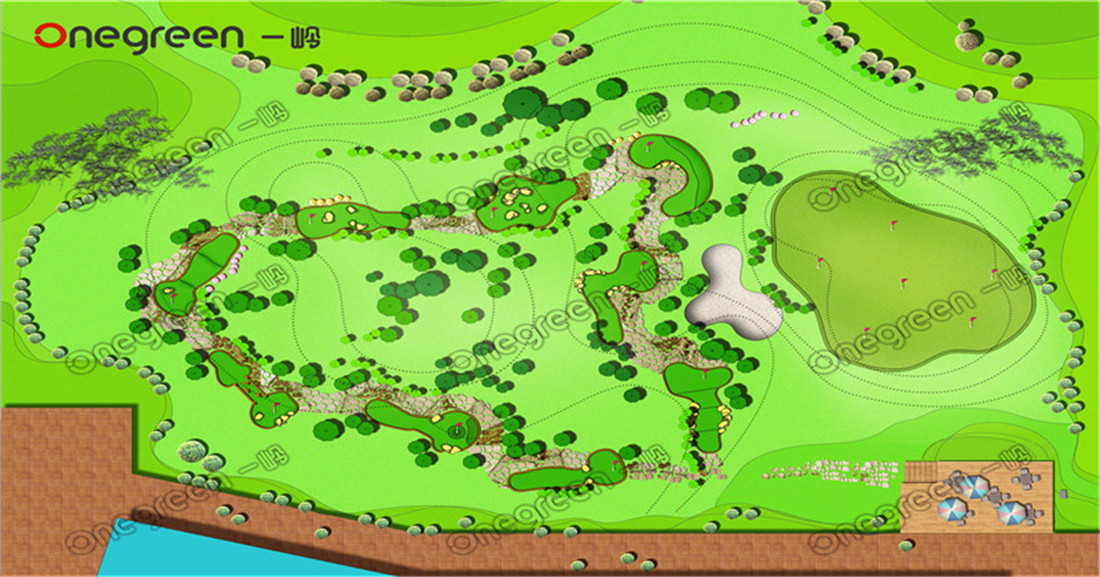 項目位于廣東廣州,由一個迷你高爾夫9 洞和兩個仿真草果嶺組成。總占地面積2400㎡,球道面積350㎡,果嶺420 ㎡。結合休閑、 娛樂為一體的美式迷你高爾夫。遵循使用合理性,景觀設計的多樣性,設計尺度的科學性(按照消費心理學、人體工程學的要求),植物搭配講究色彩的季節性變化,給人們造成強烈的視覺沖擊,滿足人們視覺獵奇的要求。