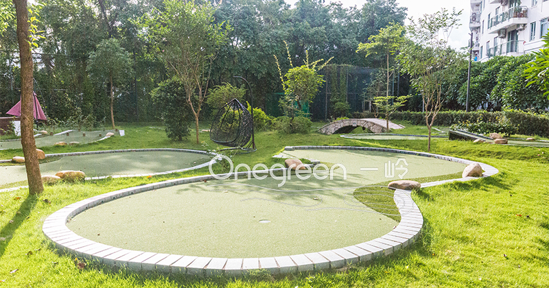 項目位于廣東深圳福田區香榭里花園小區內,由1個迷你9洞、2個沙坑和1個果嶺組成。人造草果嶺的優勢在于免維護,全透水果嶺不懼暴雨侵蝕,這些特性是保持果嶺平整,推桿線路不會變形,果嶺品質始終如一。迷你高爾夫搭配綠植成為小區一道靚麗的風景線,不僅增加了小區的綠化面積,而且為小區內居民提供了一個休閑運動的場所。